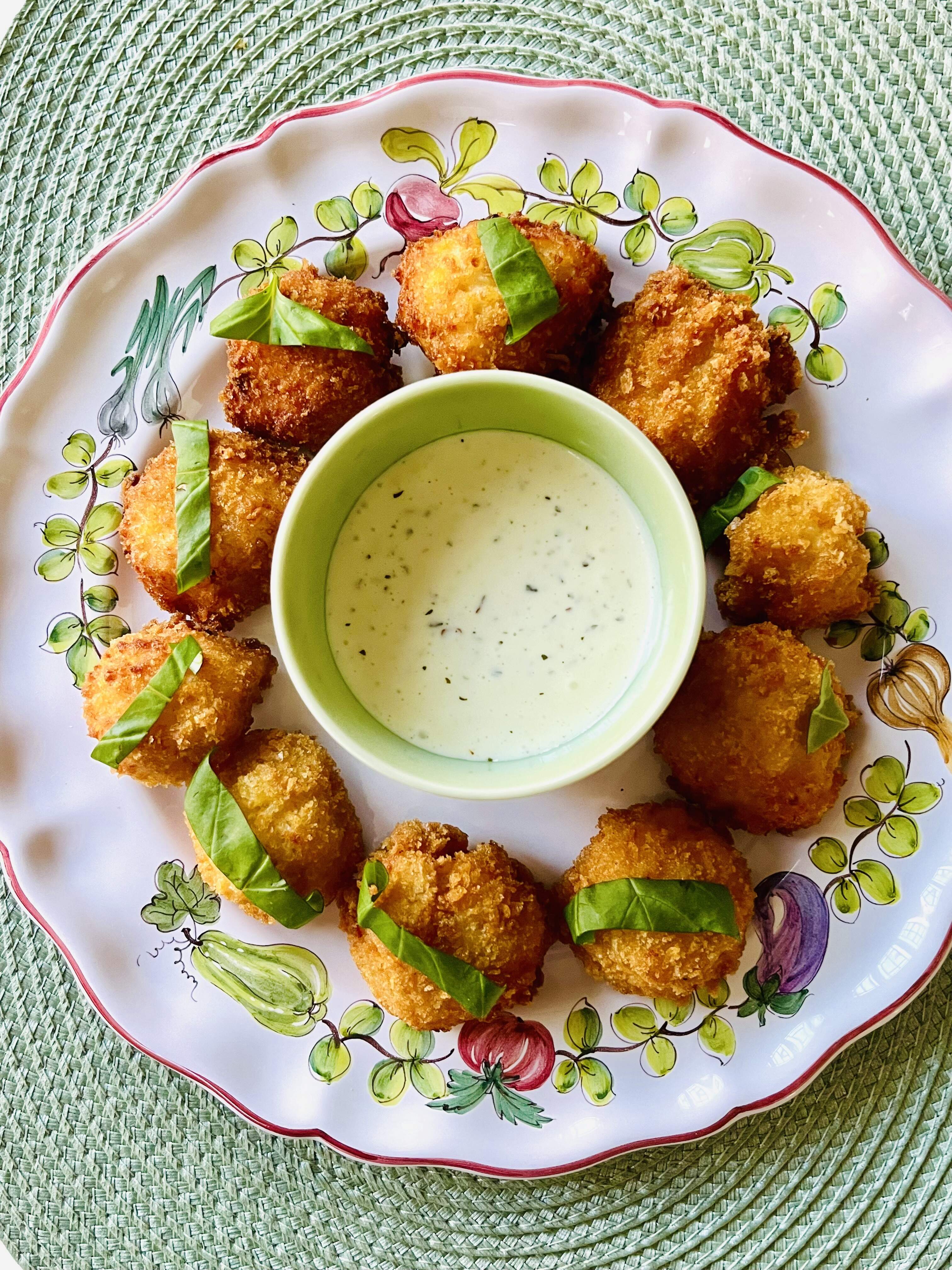 Arancini with a dot of tomato sauce and a cube of mozzarella, spiced up aioli.