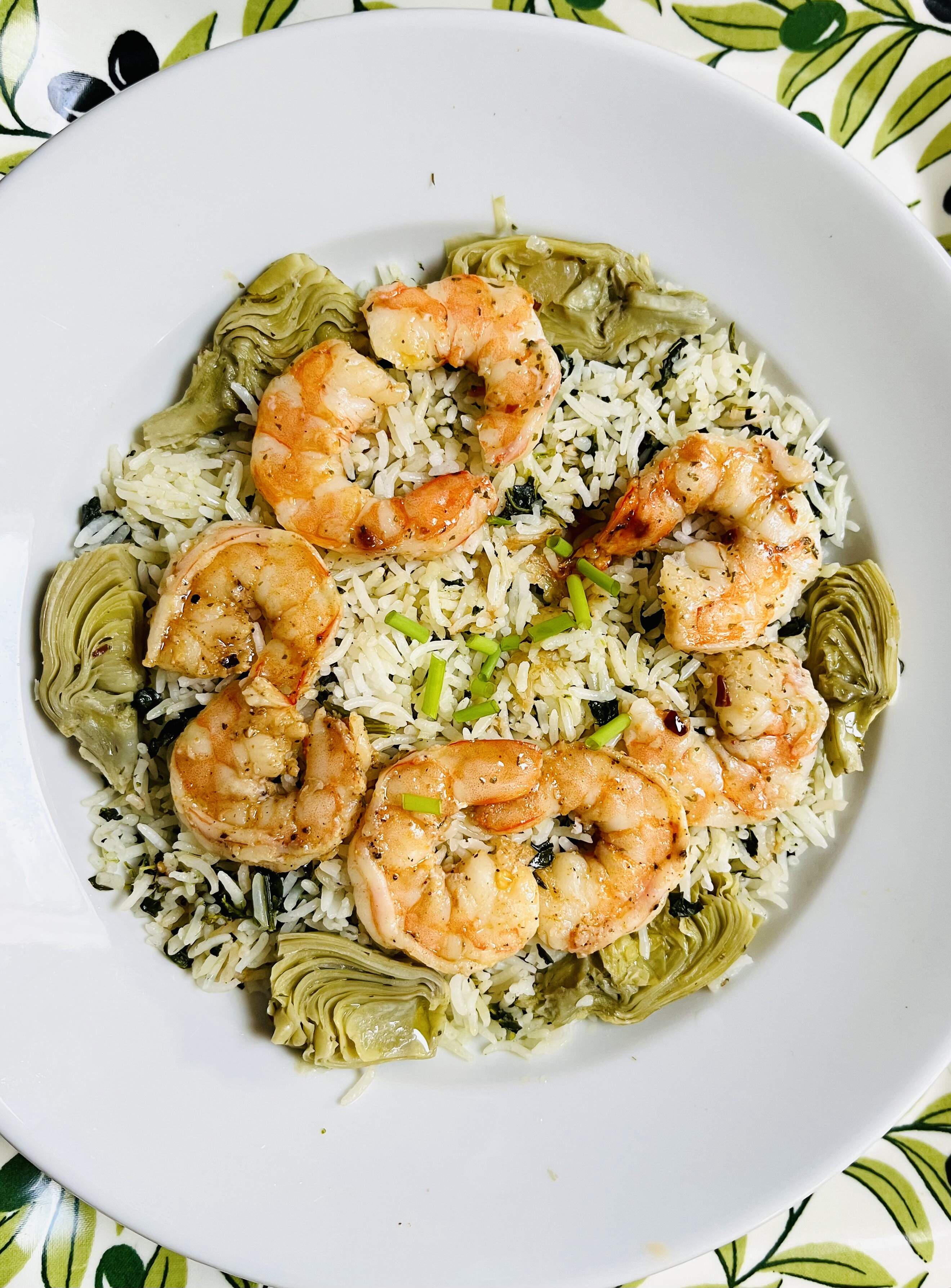 Basmati seasoned rice with spinach and sautéed artichoke hearts. Shrimp dusted with J.O. Seafood Seasoning.
