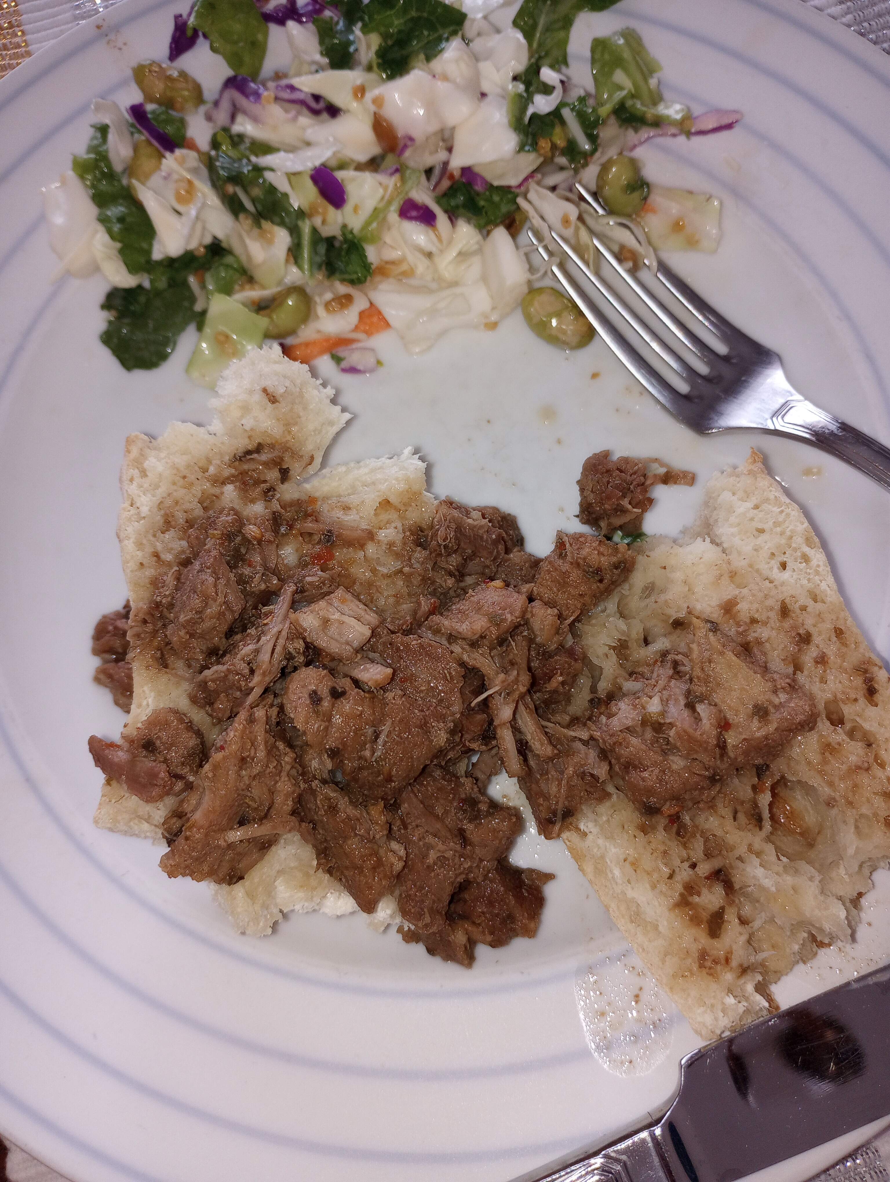 Shredded Italian beef (recipe previously posted on HO here). One change from that - use 1/2 tsp dried crushed rosemary. I like to use about a pound of Costco beef stew meat for this, and whichever beer we have in the fridge as the roasting liquid. Served over warmed baguette, with a bag salad on the side. Fresh pear half and a Rice Krispie bar for dessert.
