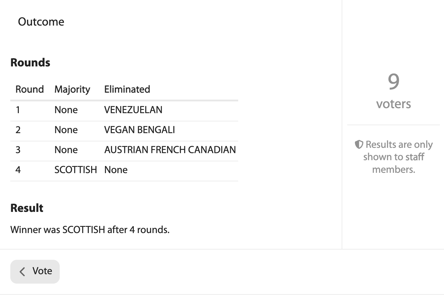 Hm, that’s weird - I thought I turned off the ability to look at the results until the poll is closed (on Jan 9). I’ll try to figure that out next time. For now, the polls remain open so dinna count ye chookies afore they’re hatched!