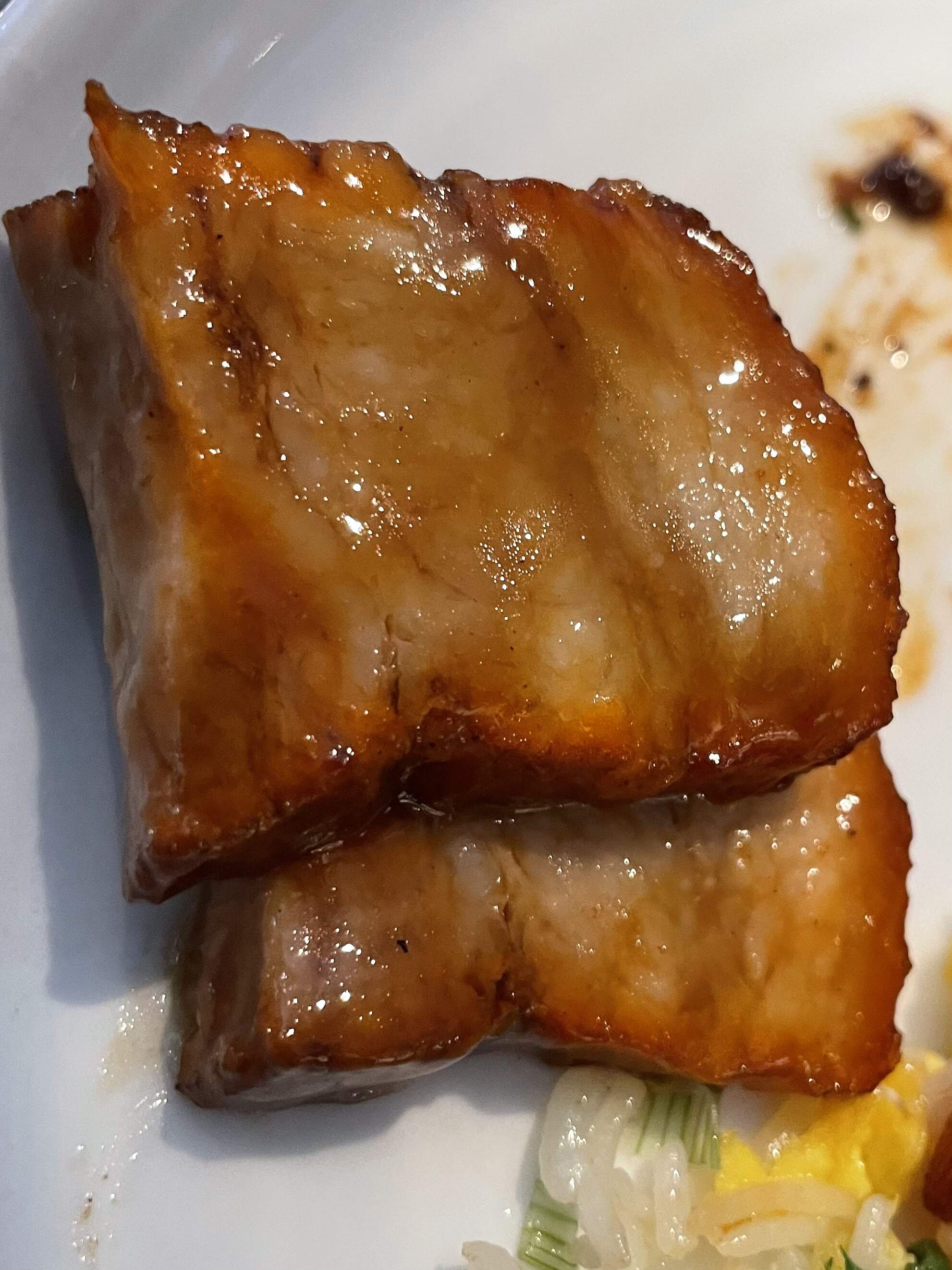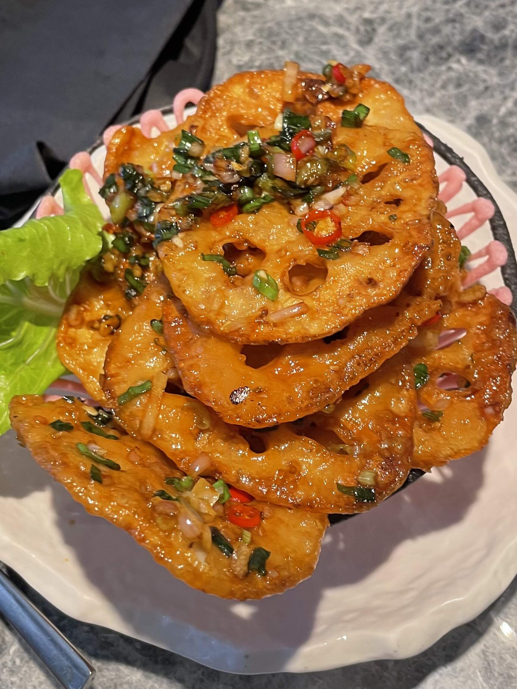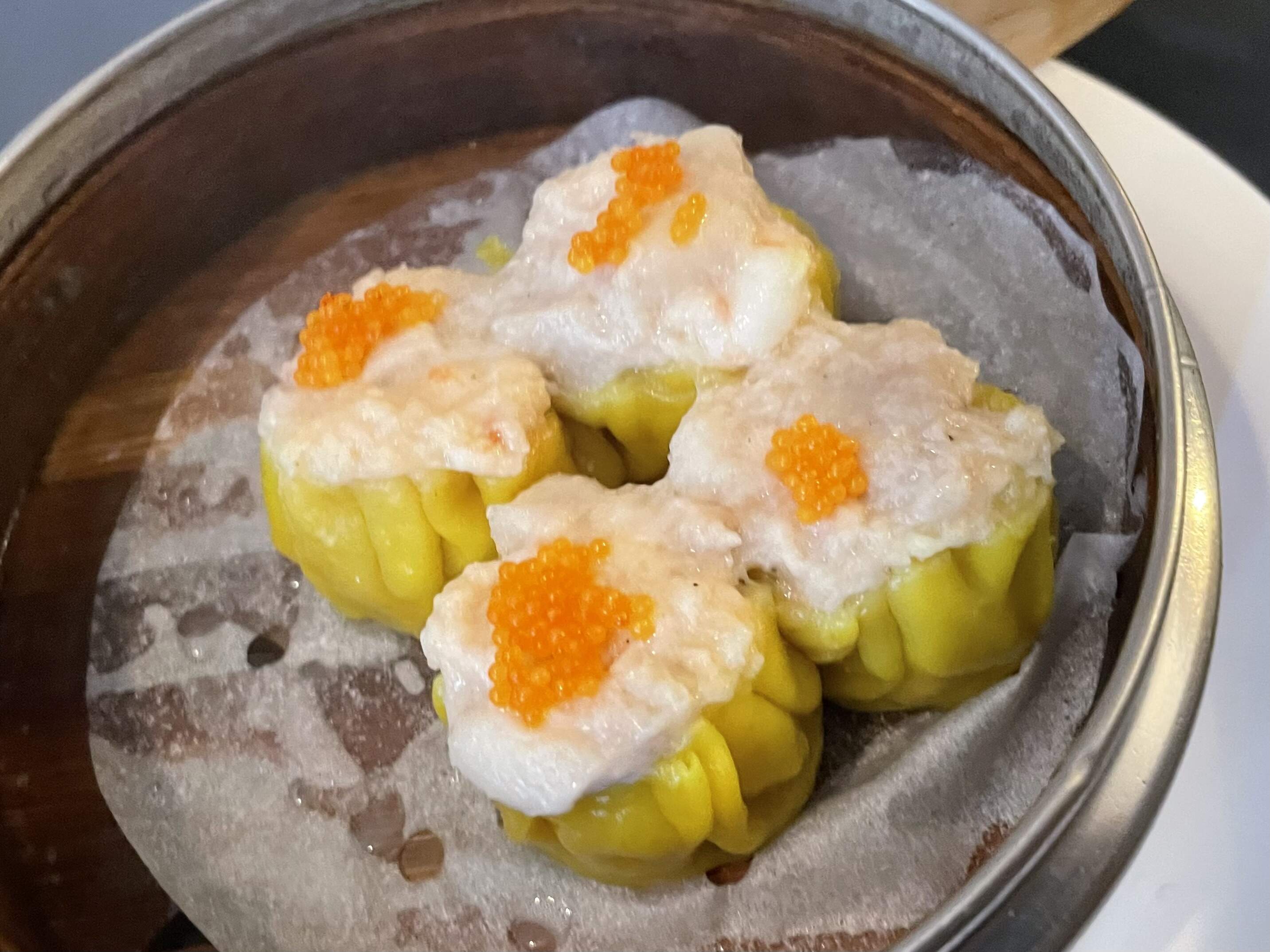 Asparagus and mushroom cheung fun, shrimp har gow, shiu mai, vegetable spring rolls, turnip cake with crispy garlic, spicy wontons, sweet corn soup, young chow fried rice, Hong Kong noodles, spicy crunchy lotus root, beef with black bean sauce, lamb with spring onion and ginger, pork char siu, and if that wasn’t enough, a pile of dessert (including sticky toffee pudding in a delicious burnt sugar cage).