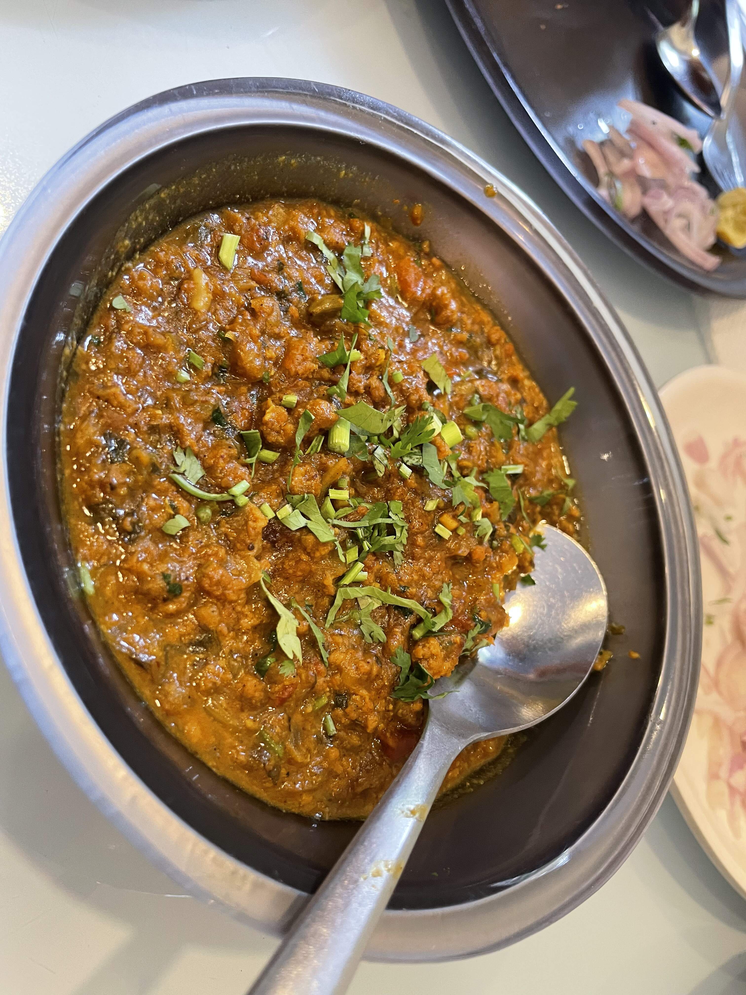 — a visit to the main museum, to see a new gallery and a new exhibit. It was good that we went to lunch first, because the purported 1 hour museum capacity was vastly exceeded. We introduced one kid to Parsi food – Mutton Dhansak with brown rice & kababs, Mutton Salli Boti, Chicken Farcha, and Kheema, plus Lagan nu Custard, Caramel Custard, and Lemongrass Tea (also Mutton Sandwiches packed for later).
