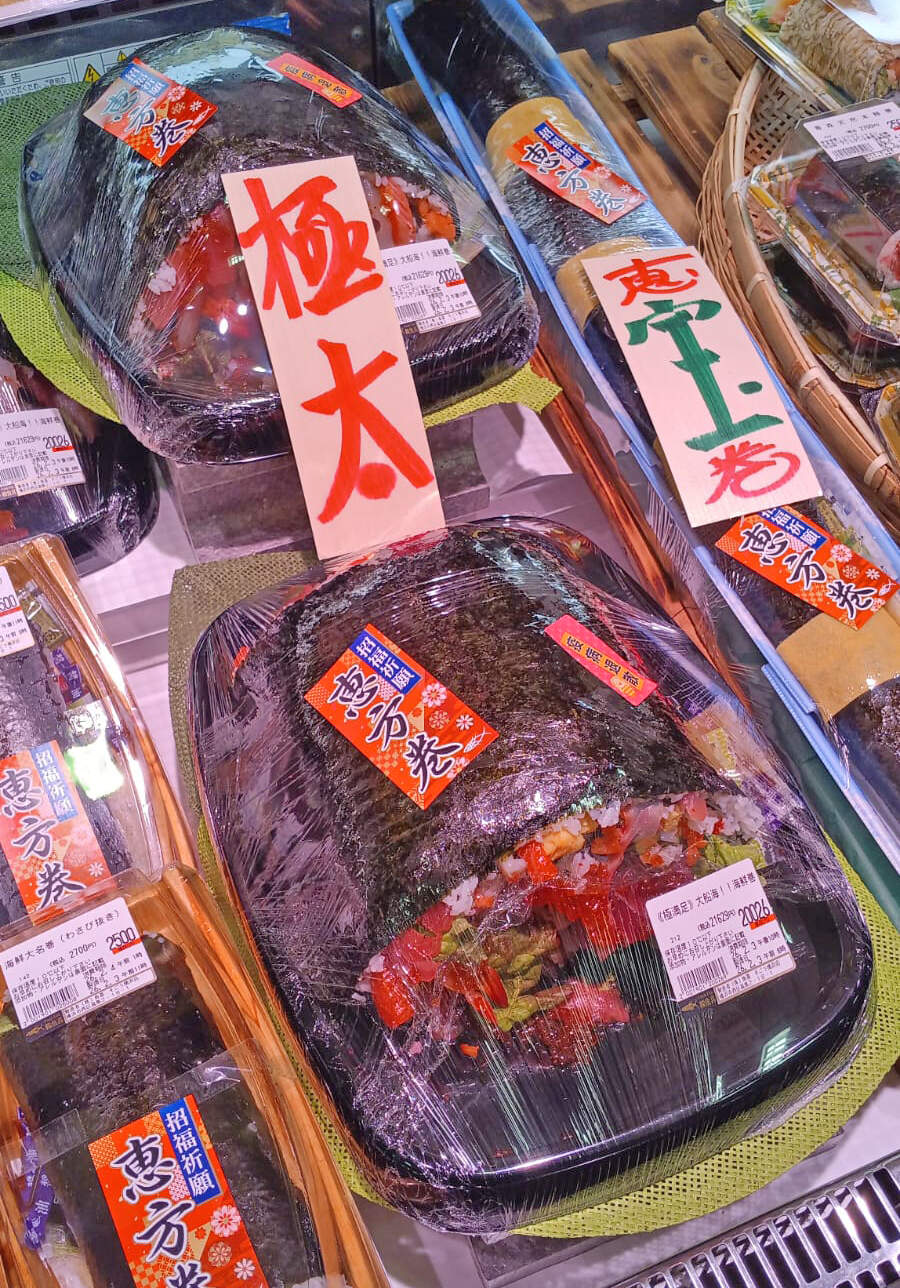 The Japanese 極太 atop the pair says “very thick,” no sh*t. One costs around 140USD, and could feed Brunei. To the left of the duo is a more common ehomaki shape.