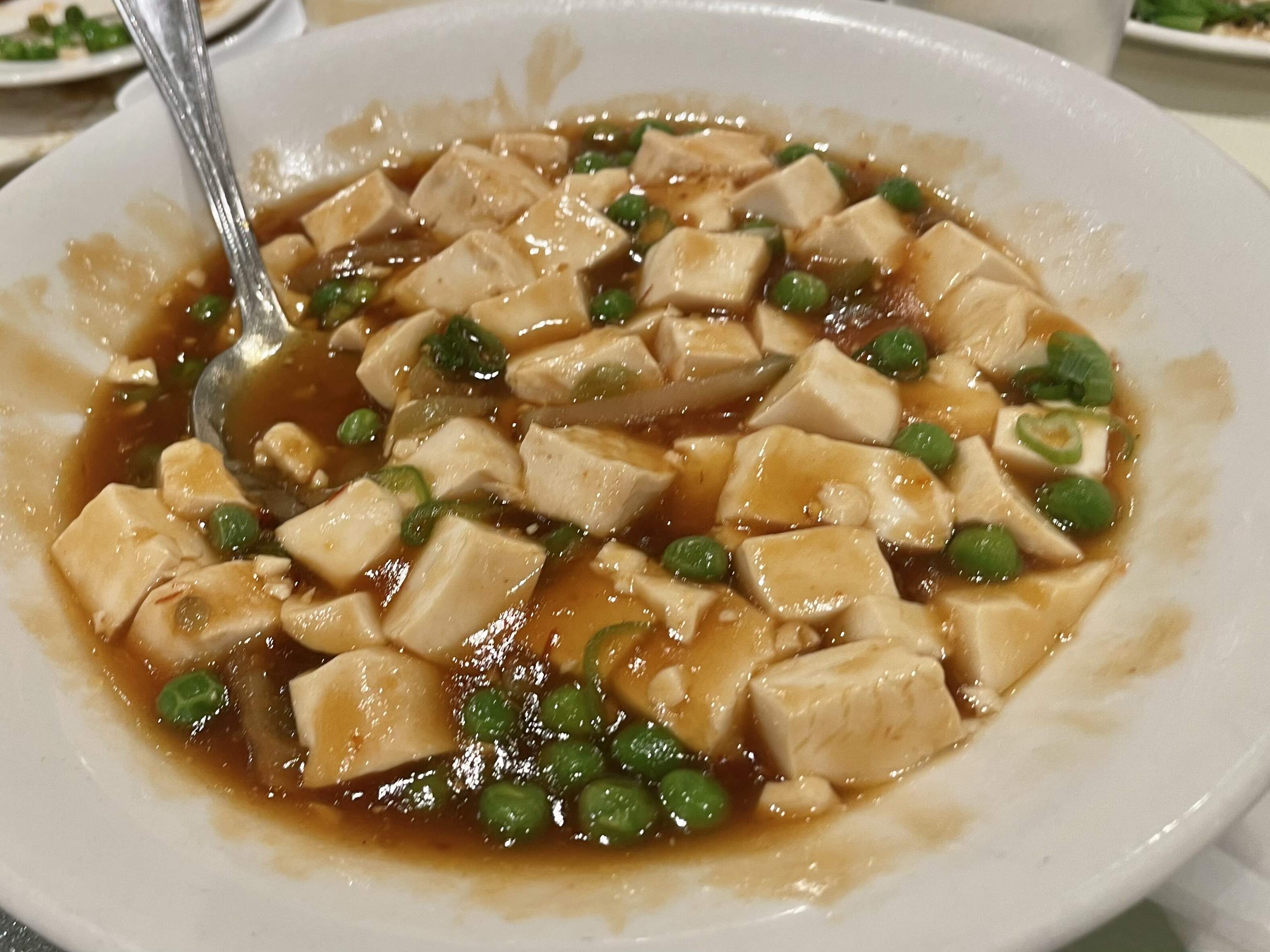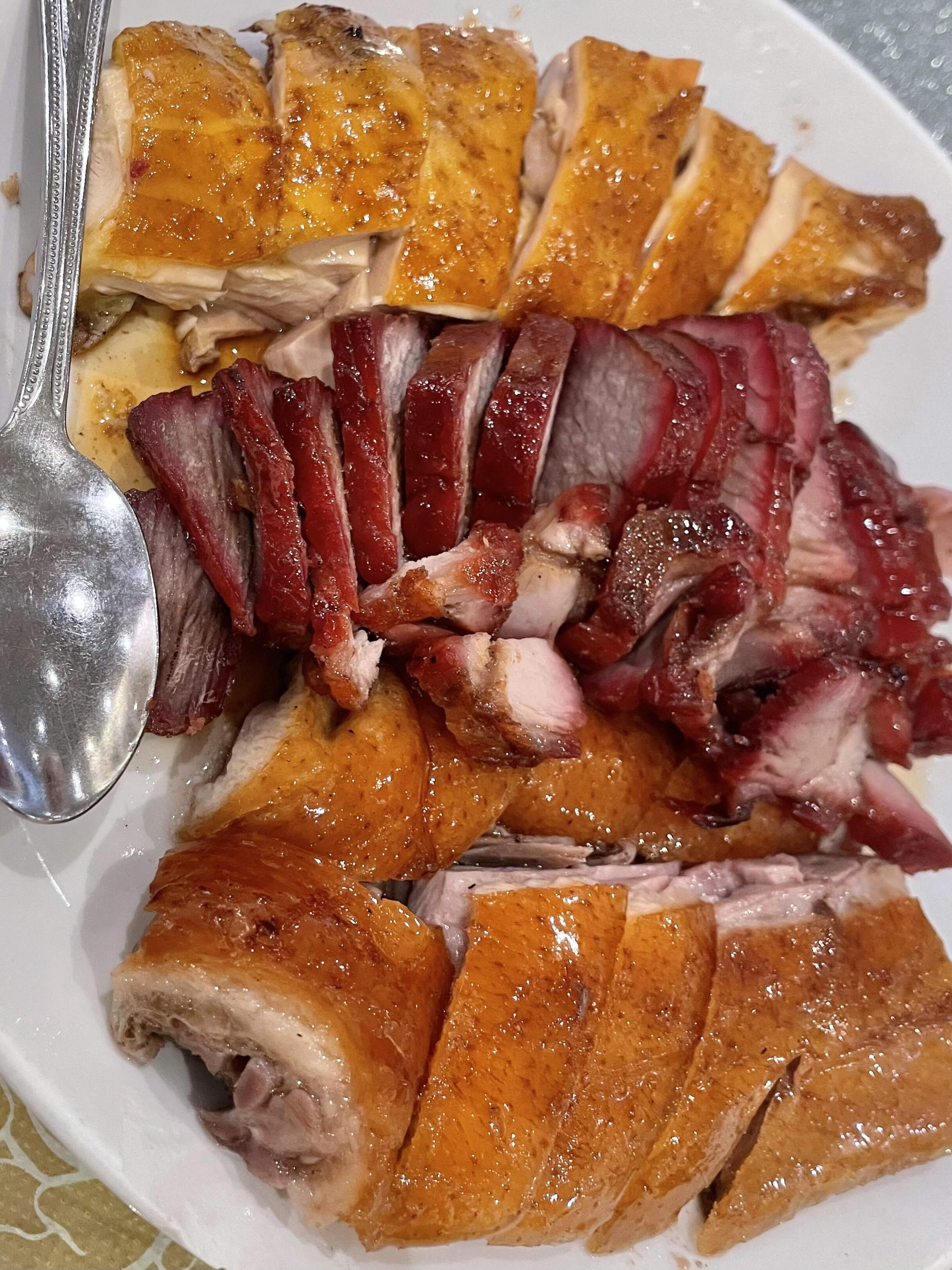 The misses for me were pan-fried noodles with chicken and vegetables – sauce was gloppy at arrival, as I’ve noted about some other dishes here in the past. The tofu someone insisted on was also less than, and went mostly uneaten. Platter of 3 roast meats was good but not great – the soy sauce chicken was best, roast duck was fine, char siu was not great.
