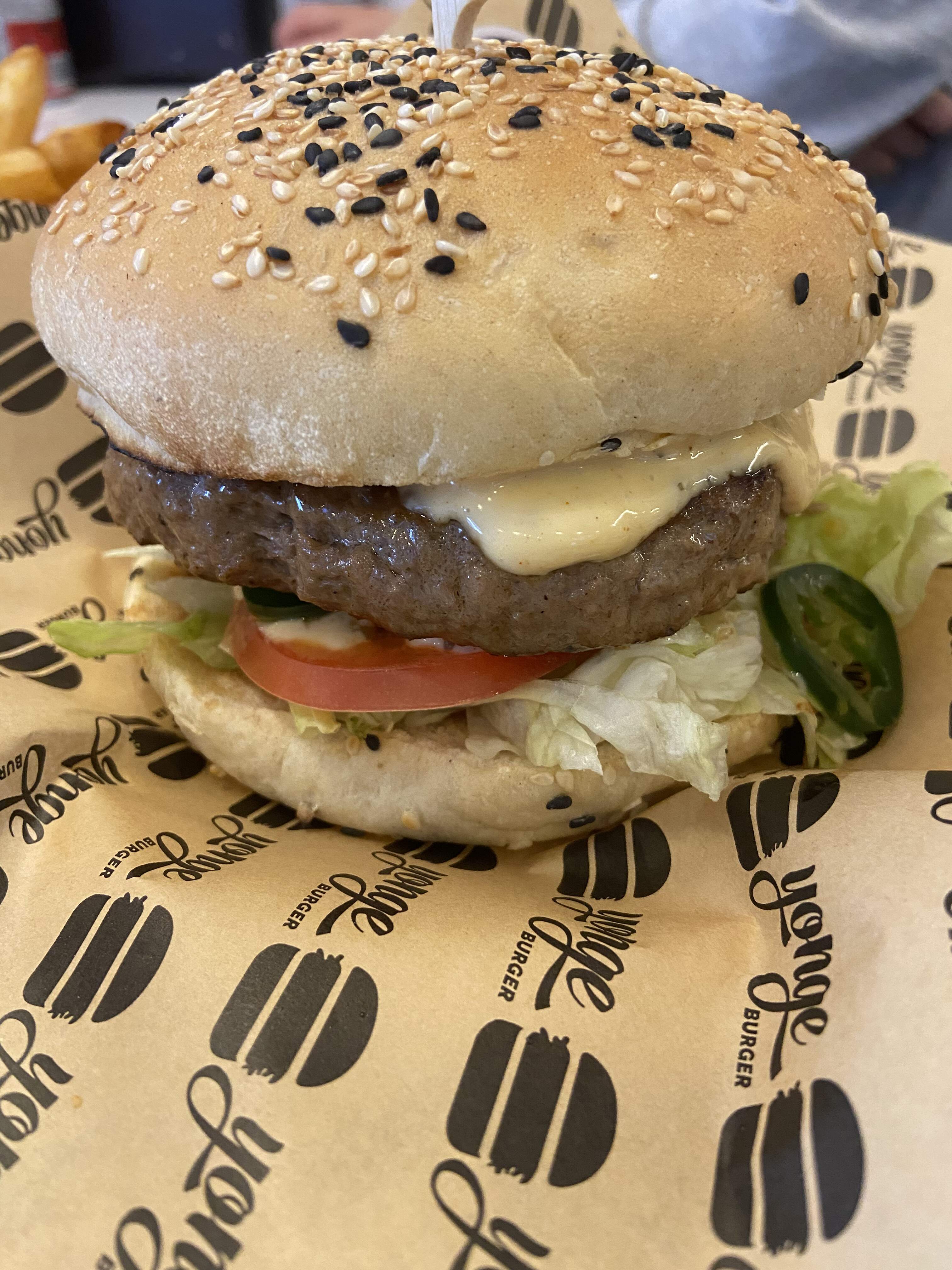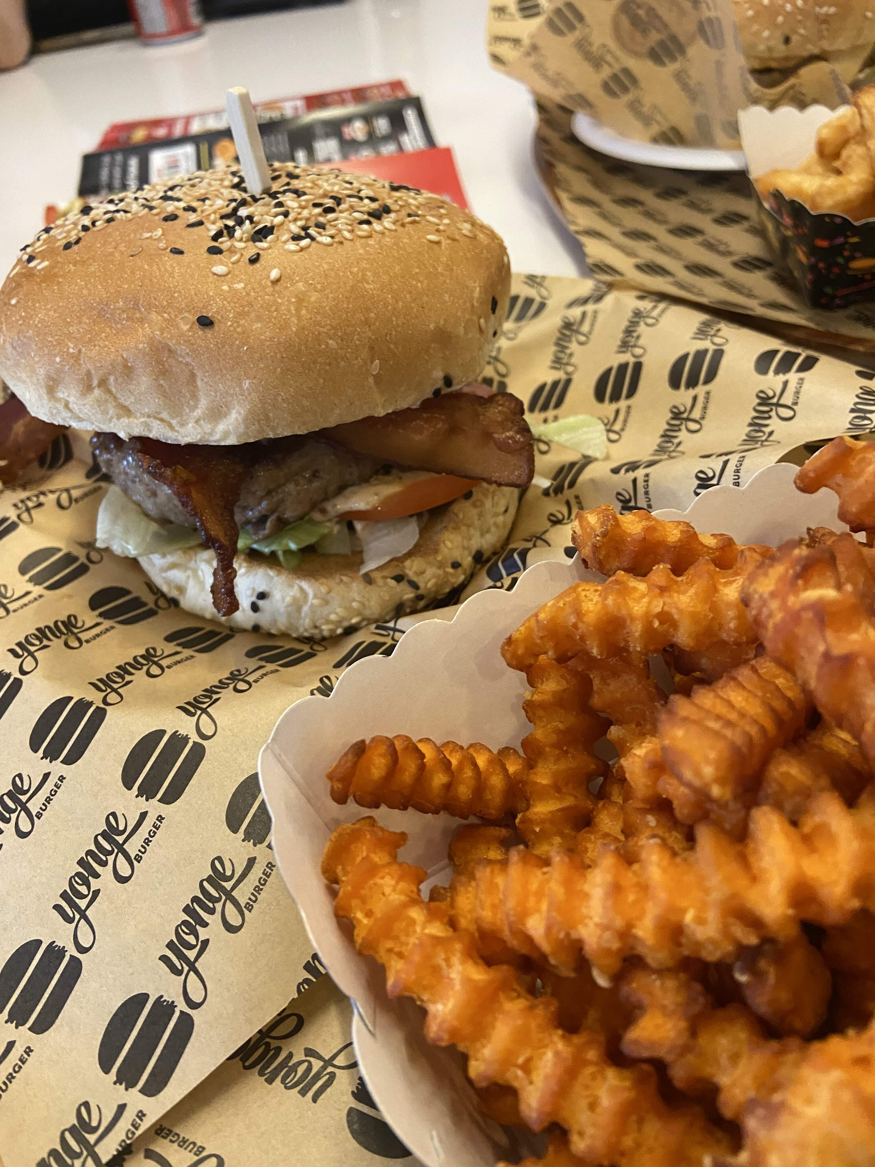 Well dressed and sandwiched between a nicely structured, pillowy Sesame bun.Impressive tasting condiments and sauces paired with stand out optional add-on like thick cut Apple wood smoked bacon…etc.