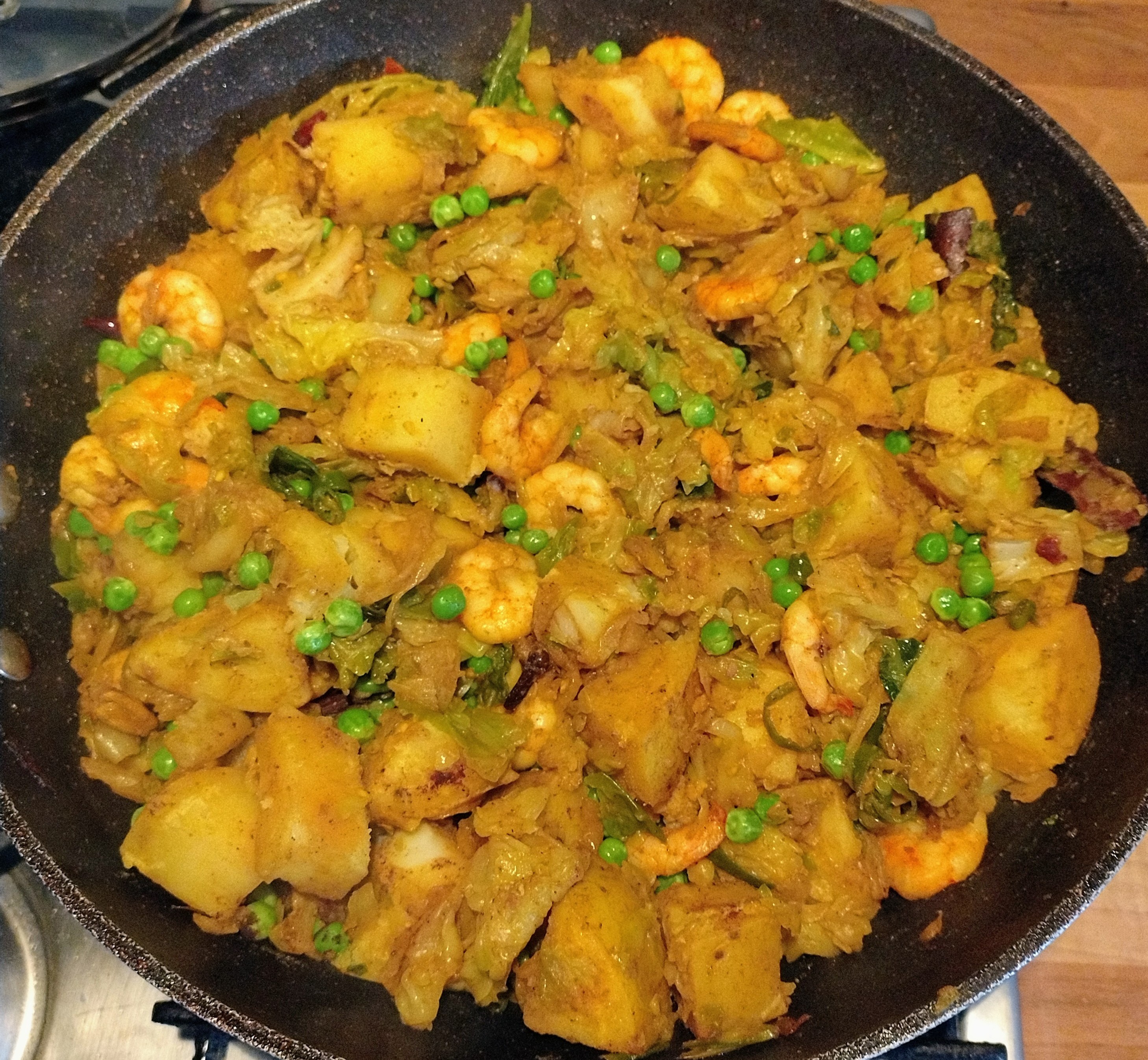 A dry preparation of cabbage, potato, peas and small prawns/shrimp, with the flavour profile from garam masala (both whole and powdered) and turmeric. I think this is more of a Bengali home-cooking sort of curry because I’ve never come across it in a restaurant.