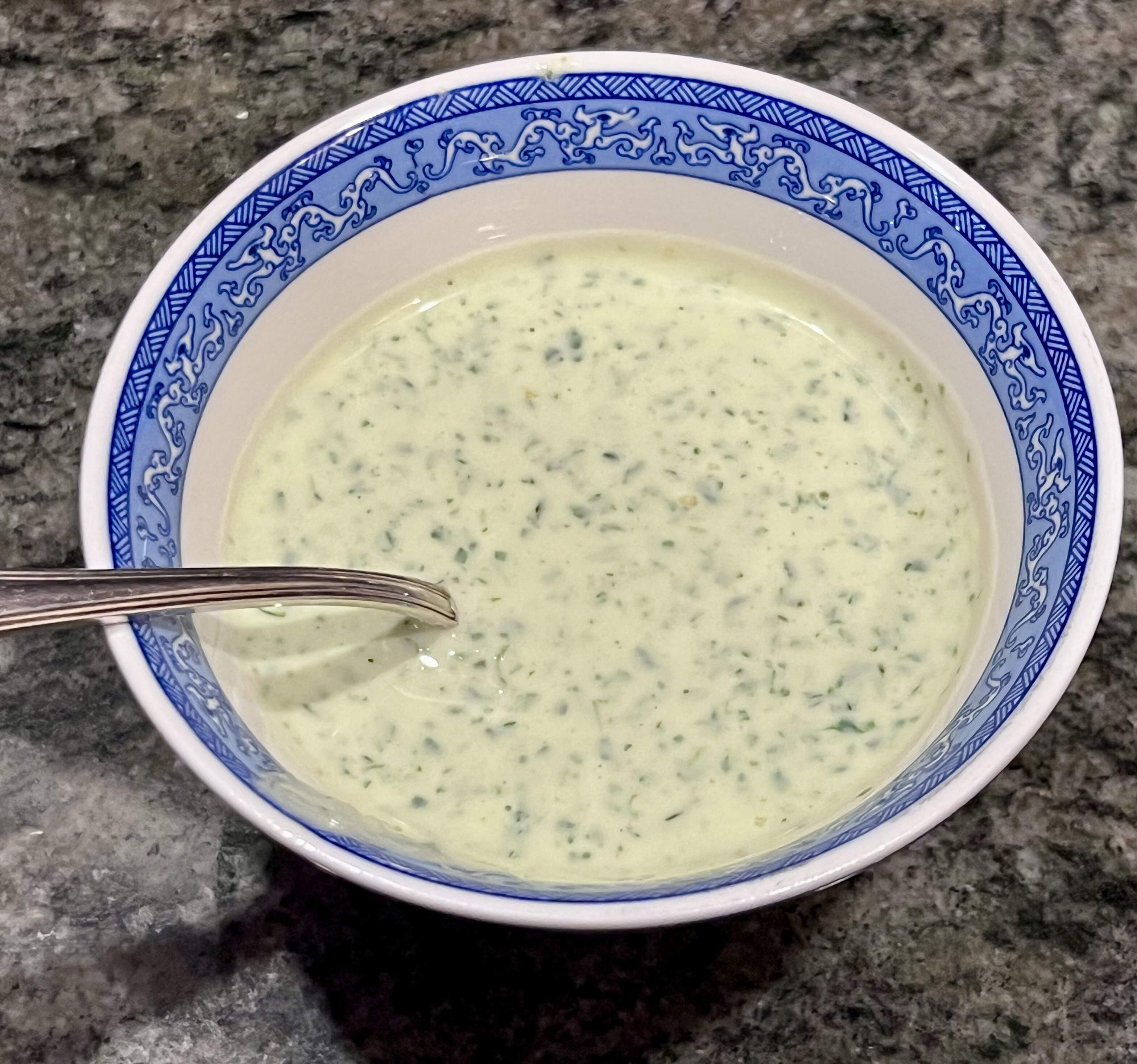 I used Greek yogurt, mint, cilantro, lime juice, toasted cumin, salt, garlic, splash of water, and two unexpectedly VERY HOT green chilies ![]()