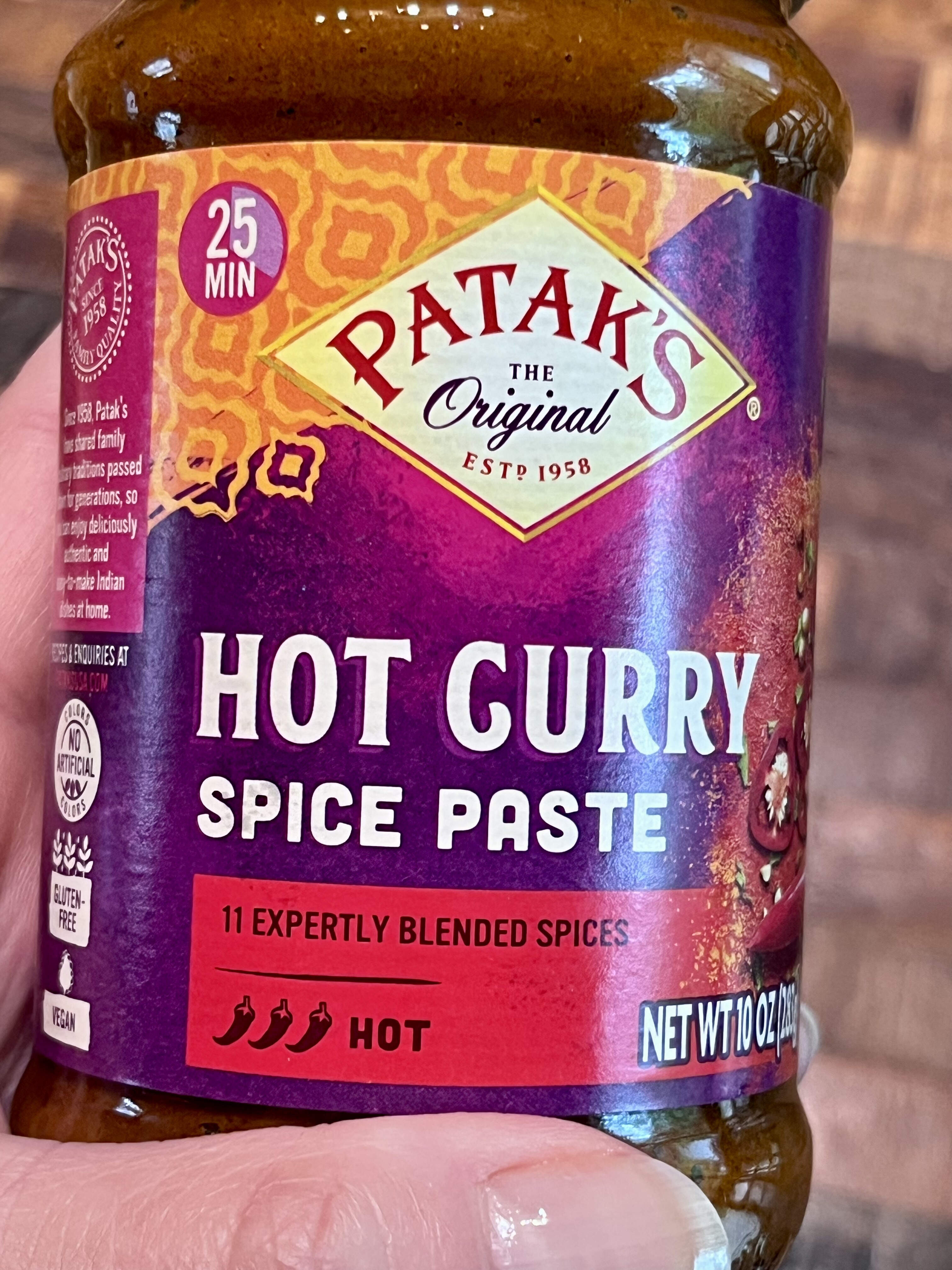 I ended up settling on this hot curry spice paste, remembering that we have coconut milk in the house to thin it out some — plus of course we always have TPSTOGAG to add, as well as onions, green peppers, and a red pepper I picked up at the store along with the curry paste ![]()