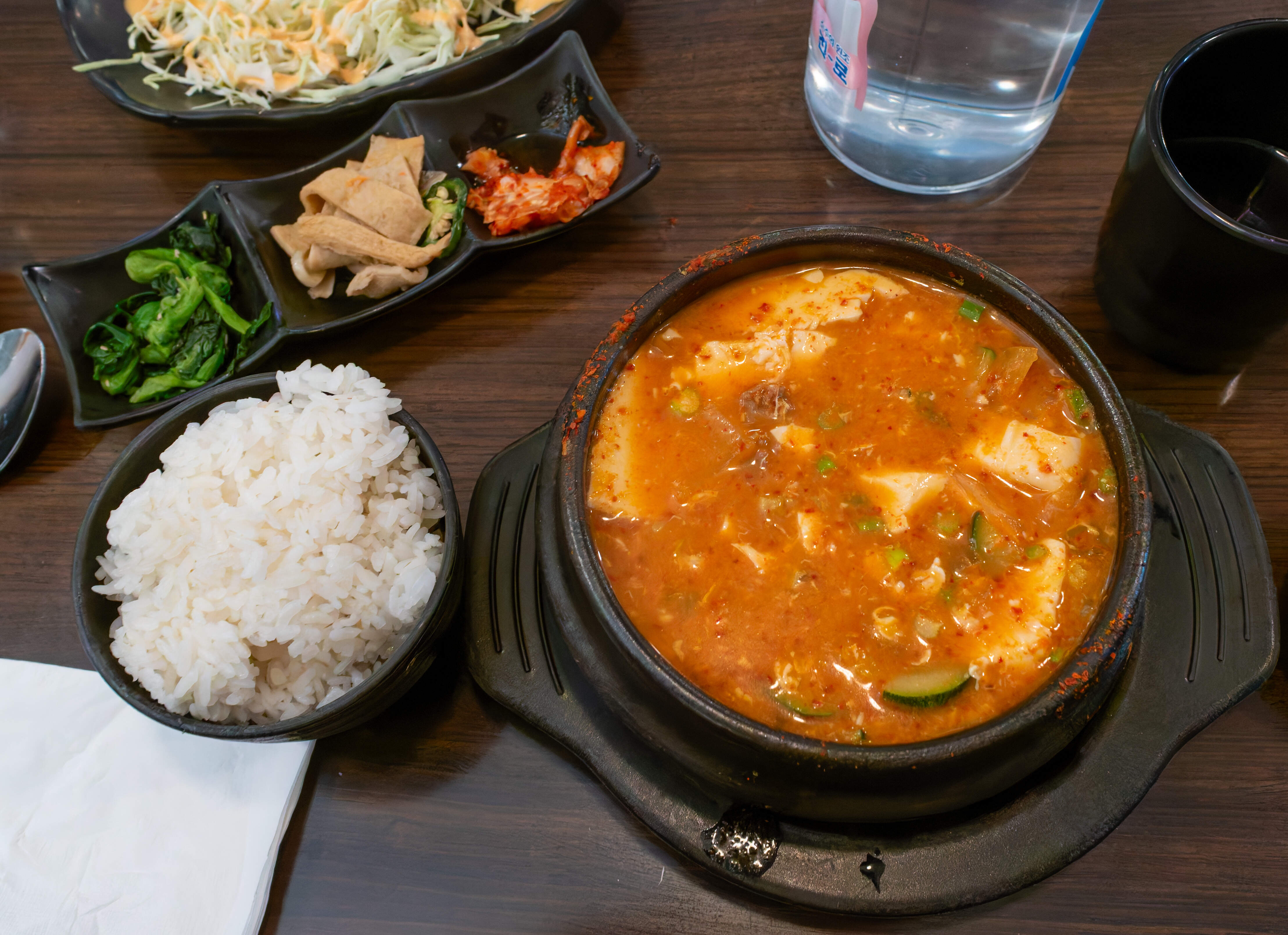 The soft tofu stew with the raw egg mixed in, and the rice. It was a good bowl of soft tofu stew. I mixed in some of the rice and also some of the kimchi from the banchan while eating it.