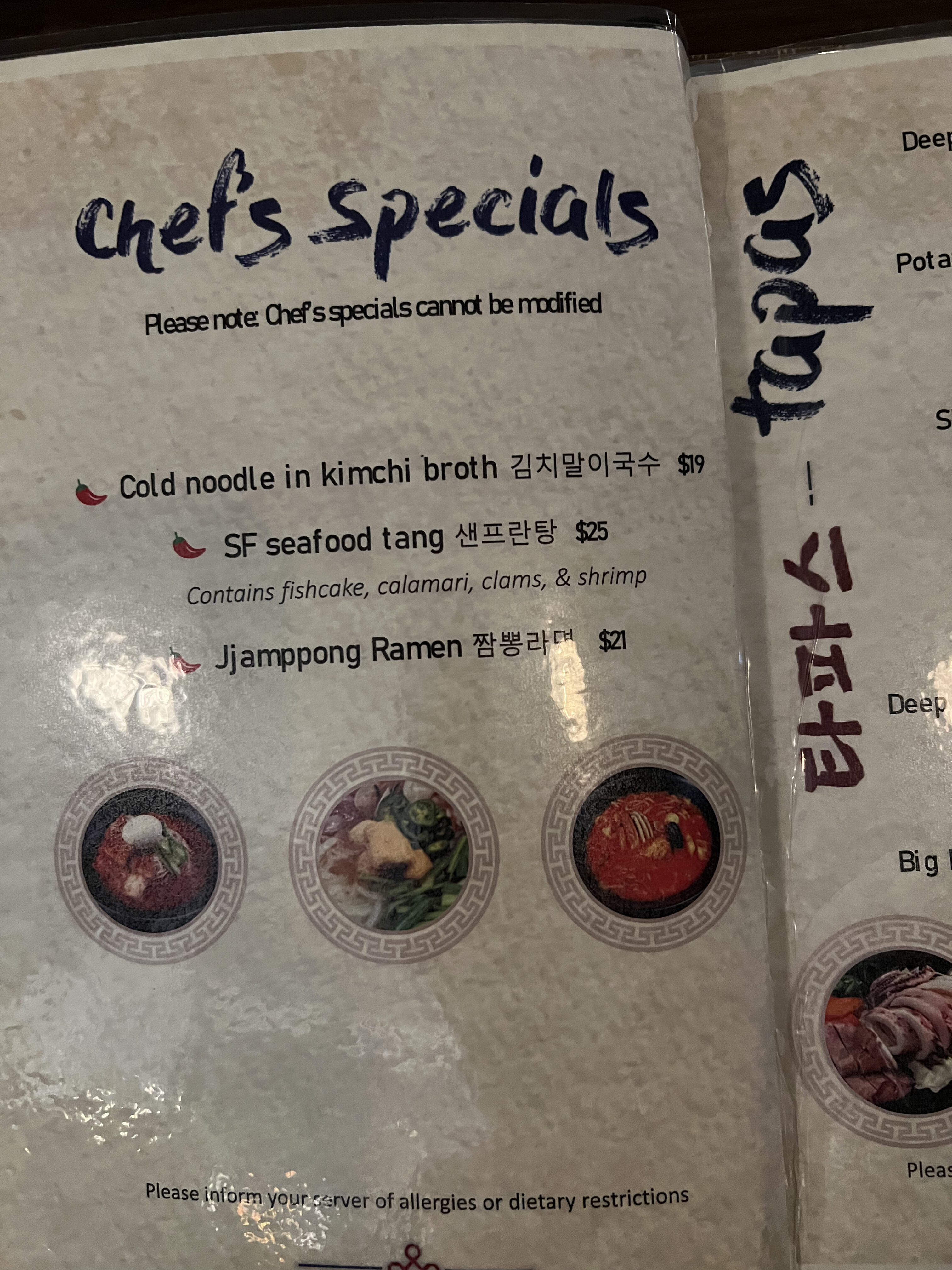 I took a flyer on this new place on the outskirts of the Tenderloin the other day. It’s a modern–style Korean snackery/soju bar. It’s somewhat like Toyose in its offerings but a lot more convenient for most of us, I would think.